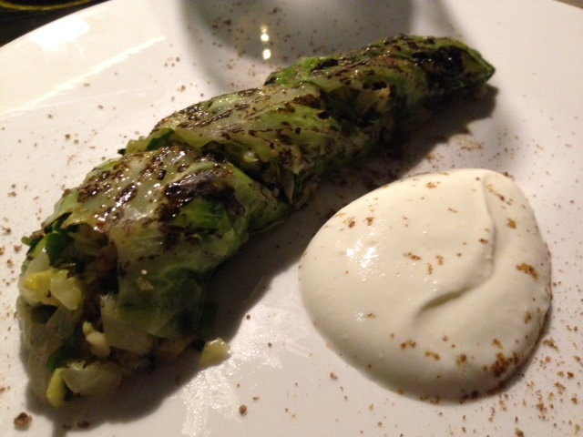 Jag valde tre lyxiga rätter (trots att menyn rekommenderade fyra för att bli mätt) med bland annat spetskål med libanesisk tartar, bakad lök med jordärtskockschips, Karl-Johan svamp och tryffelkräm samt inbakat päron med ingefärssås. Dagen till ära fanns det kött från ungdjur och någon vit fisk tror jag bestämt. Jag minns inte riktigt för vi var där för att prova det gröna. Dock kunde tillvalet av kött eller fisk också skrivits ut i menyn.