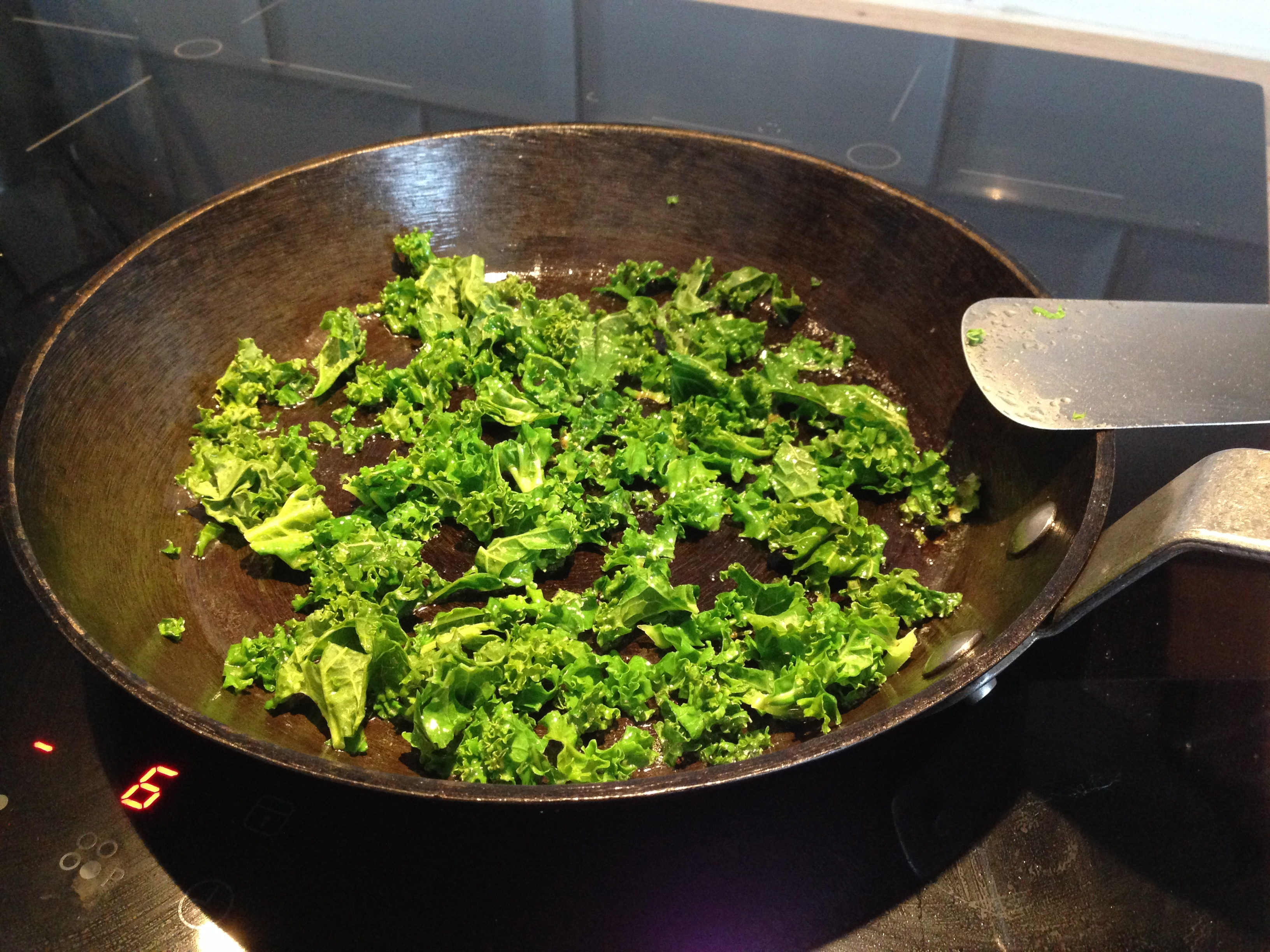 Stek tills du ser att grönkålen börjar krympa (vattnet försvinner, här får du hålla kolla så att du inte bränner den, det går fort)