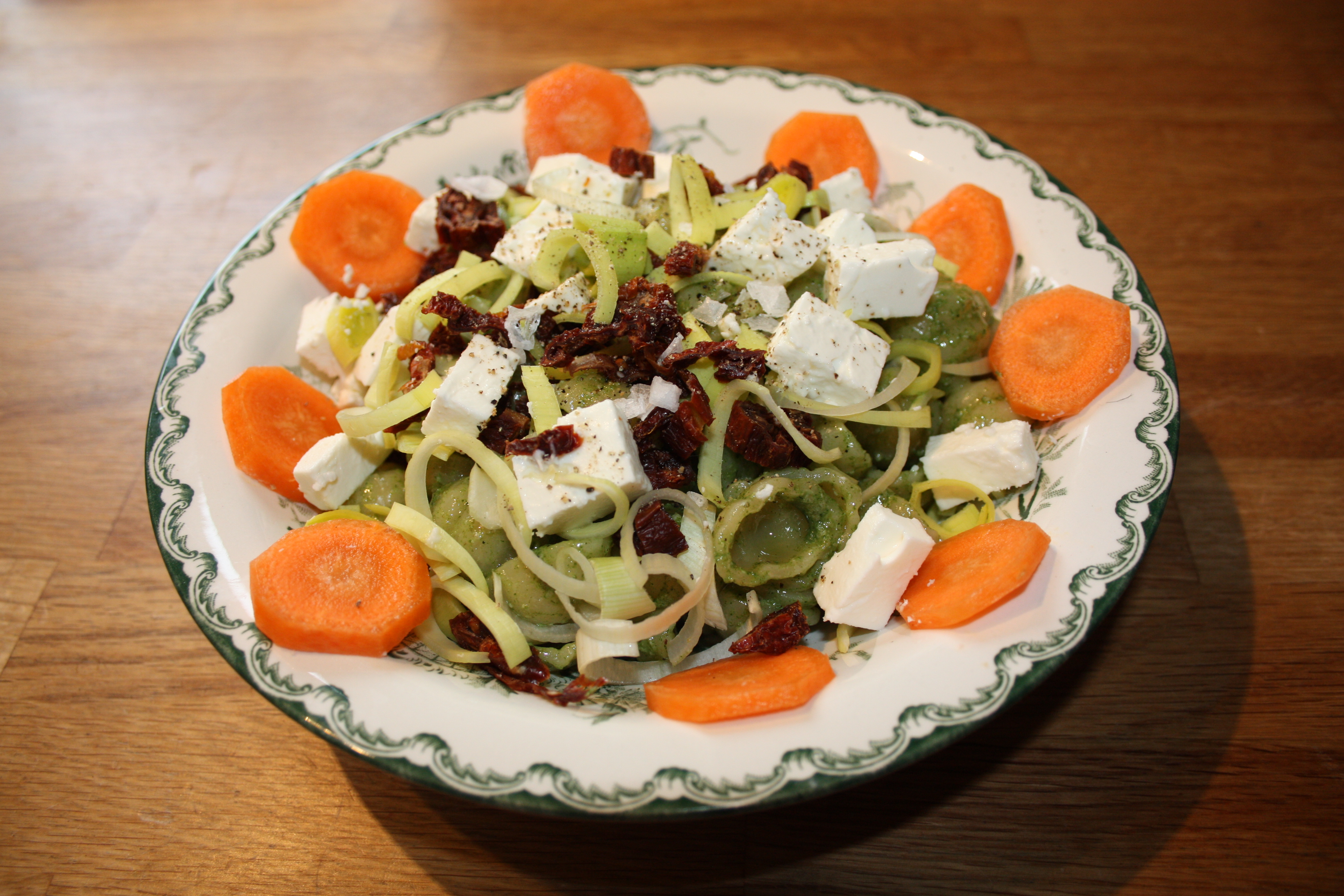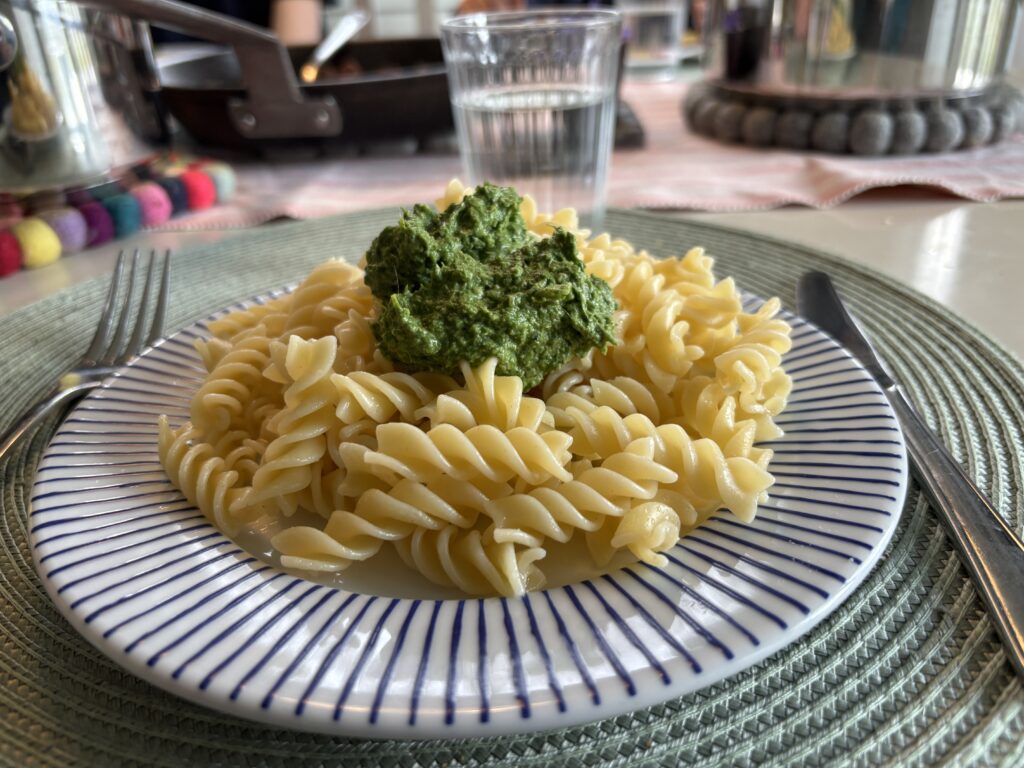 Denna goda pesto kan du sedan äta som den är på ett knäckebröd eller varför inte blanda upp i en uppkokt pasta som jag gjorde. Jag toppade också med några bitar fetaost, soltorkade tomater, morötter och purjolök och hepp så var en god och näringsriktig lunch fixad!