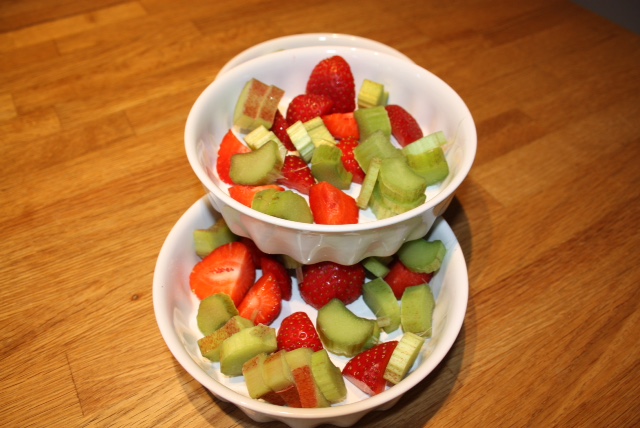 Rensa, skölj och skär önskat antal rabarber och jordgubbar i bitar.