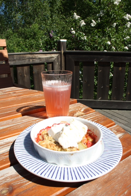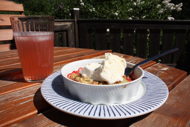 Rabarber mixat med jordgubbar täckt med smuldeg och en klick vaniljglass är det som faller mig bäst i smaken. Kan det dessutom förtäras ute i solen så är lyckan gjord!